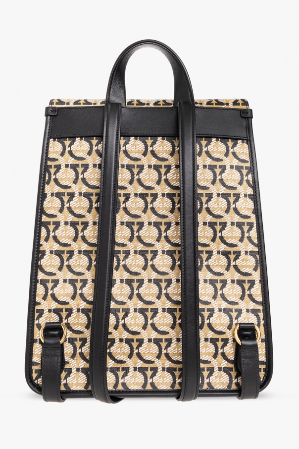 Beige, black and white backpack from Salvatore Ferragamo. Crafted from canvas decorated with the brand's Gancini motif, this design cinches closed with drawstrings and features a signature Gancini fastener, calf leather trims, a flapped pocket with a magnetic closure, a half-round handle, adjustable shoulder straps, gold-tone metal hardware and a red-clad interior with one compartment and one slip pocket.