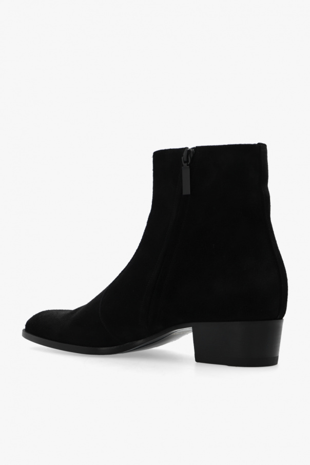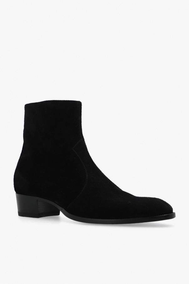 Black ‘Wyatt’ ankle boots from Saint Laurent. Made of calf suede, this pair is complete with a side zip, rounded toe and black leather sole.