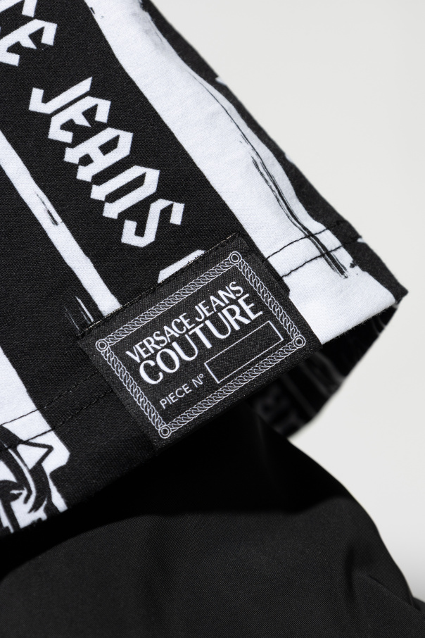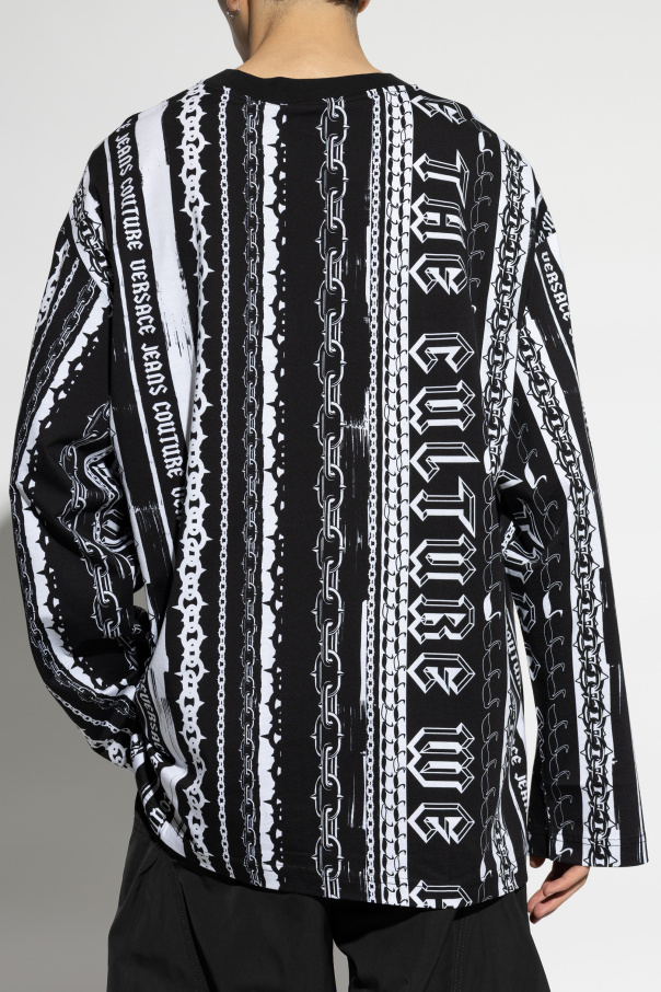 Introducing the epitome of urban sophistication, the Versace Jeans Couture T-shirt. Crafted by the illustrious Versace Jeans Couture, this black T-shirt is a testament to opulent streetwear. Adorned with a striking vertical pattern of white and black elements, the design features intricate chain motifs, ornate details, and the bold inscription "THE CULTURE WE" in a stylized font. The signature "VERSACE JEANS COUTURE" is interspersed throughout the pattern, adding a distinguished touch. Constructed from premium-quality cotton, this T-shirt ensures unparalleled comfort and longevity. The round neckline amplifies its casual elegance, making it a versatile addition to any wardrobe. A hallmark of exclusivity, the garment's label bears the "VERSACE JEANS COUTURE" branding along with a "PIECE N°" indication, underscoring its uniqueness. Why Choose This Product? High-quality 100% cotton for supreme comfort. Distinctive design with intricate patterns and bold inscriptions. Exclusive label detailing, highlighting its uniqueness. Versatile round neckline suitable for various occasions. Renowned Versace Jeans Couture craftsmanship.