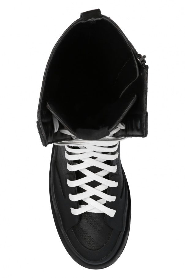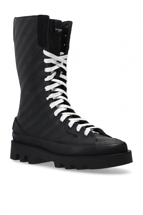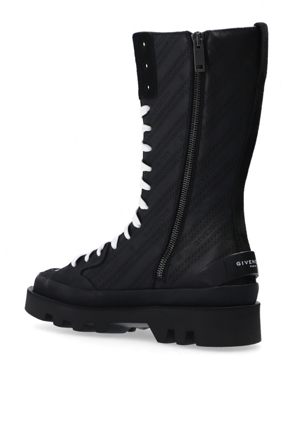 Black ‘Clapham’ mid-calf boots from Givenchy. Crafted from leather, this lace-up pair rests on a black rubber sole and showcases embossed black logo pattern and printed white logo on the rear.