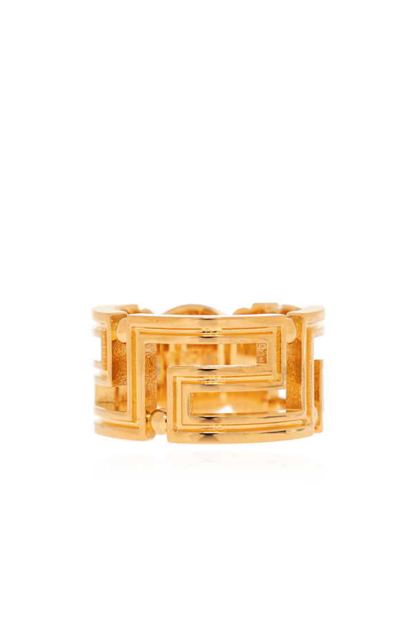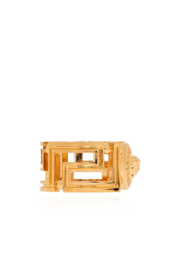 Introducing an exquisite Golden Ring with Greek Pattern, designed by the illustrious Versace. This opulent piece is masterfully crafted from 100% metal, boasting a lustrous gold hue that radiates luxury. The ring is adorned with intricate decorations, featuring classic Greek motifs such as meanders and other geometric shapes, culminating in a central medallion that elegantly displays a profiled face or mask, surrounded by a decorative pattern. The ring's three-dimensional form and detailed embellishments are highlighted in various perspectives, revealing its substantial and exclusive nature. Worn, it offers a glimpse into the scale and manner of its bearing, presenting itself not merely as a piece of jewelry but as a statement of craftsmanship and heritage. Why Purchase This Product? Designed by the renowned Versace, ensuring a blend of style and sophistication. Featuring classic Greek motifs, adding a touch of historical elegance. Crafted from high-quality metal with a luxurious golden hue. Exudes exclusivity and opulence, perfect for those seeking a distinctive accessory.