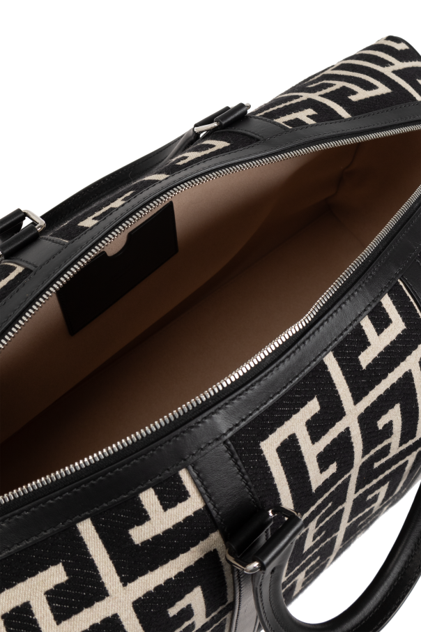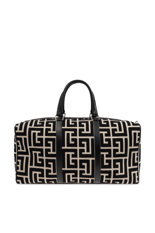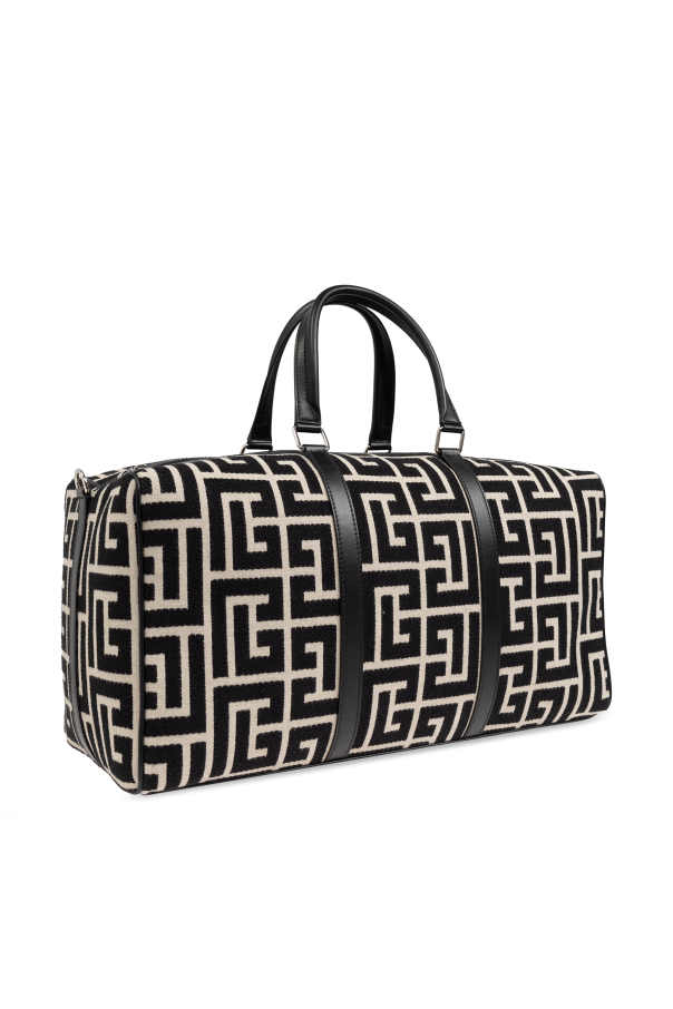 Introducing the Balmain Handheld Bag from the exclusive fashion collection by the esteemed French fashion house, Balmain. This rectangular bag with rounded edges exudes contemporary elegance, making it the perfect companion for your travels. The bag's dominant black hue is beautifully contrasted by a beige geometric pattern, creating a luxurious and sophisticated appearance. Crafted from high-quality textile material, it promises durability and resilience. The handles and straps, meticulously fashioned from black leather, elevate its exclusive charm. Featuring two sturdy leather handles for handheld use, the bag also includes a detachable shoulder strap, adjustable for your convenience and adorned with metal elements. The dual zipper closure ensures easy access to the spacious interior, which boasts a large compartment and a zippered pocket for your smaller essentials. The detachable shoulder strap, with its engraved designer logo on the metal clasp, adds a touch of refinement to this chic accessory. Why Buy This Product? High-quality textile and leather materials ensure durability. Elegant design with a striking black and beige geometric pattern. Spacious interior with a zippered compartment for organization. Detachable, adjustable shoulder strap for versatile carrying options. Exclusive design by the renowned fashion house, Balmain.