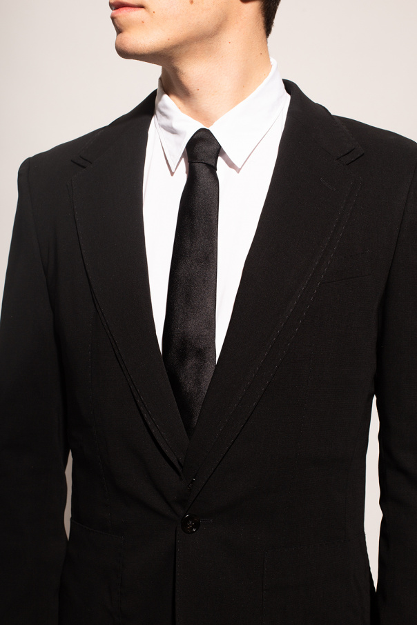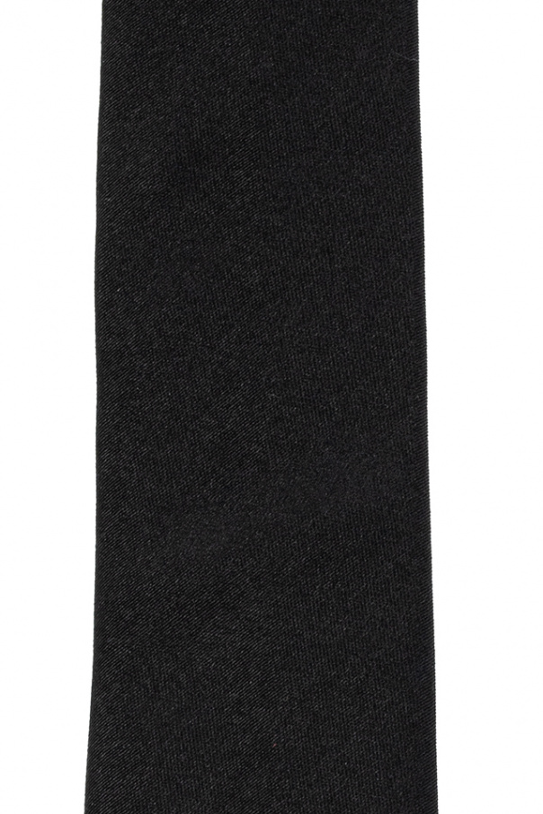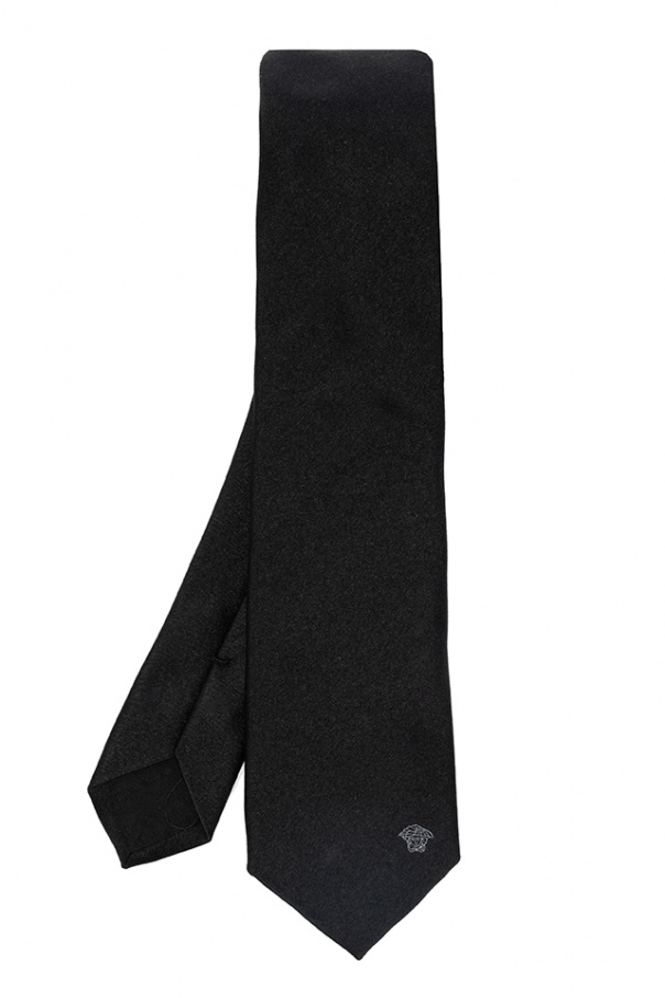 Black tie from Versace. Made of silk, this item showcases grey embroidery with the brand's logo and the signature Medusa head on the front.