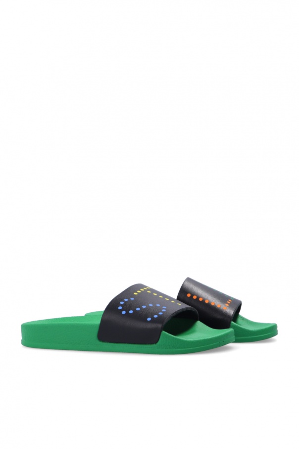 Black and green slides from Stella McCartney Kids. Resting on a green rubber sole, this pair is decorated with a printed logo pattern in navy, yellow and grey.