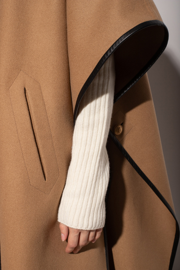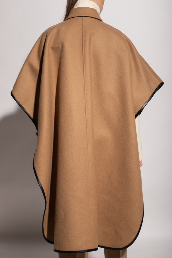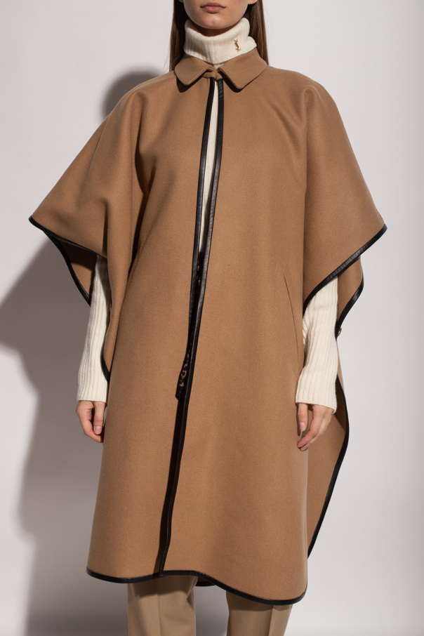 Beige poncho from Saint Laurent. Crafted from cashmere, this style features brown lamb leather trims, two slip pockets, a hook-and-eye clasp at the neck and gold-tone metal detailing with a logo on the sides.