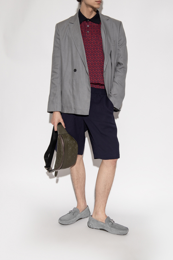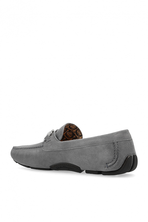 Grey ‘Parigi’ moccasins from Salvatore Ferragamo. Crafted from calf leather, this pair features the label’s signature Gancini appliqué in silver-tone and a dark brown rubber sole.