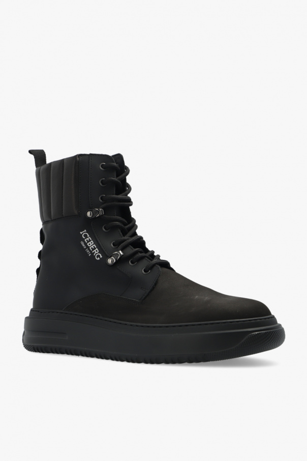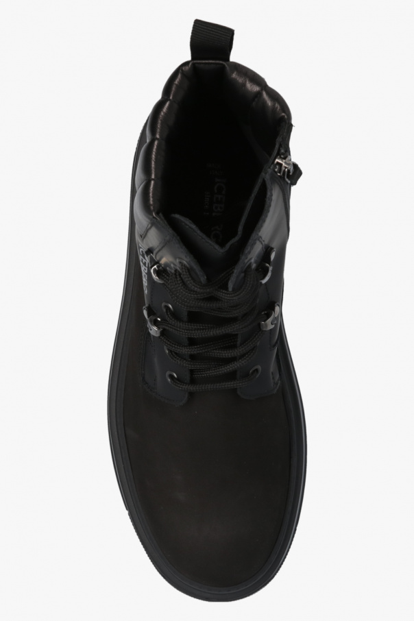 Black ankle boots from Iceberg. Crafted from leather, this lace-up model sits on a black rubber sole and features a side zipper and a silver-tone logo print.