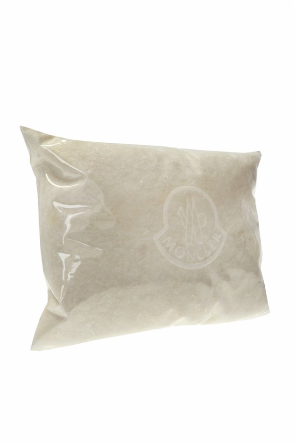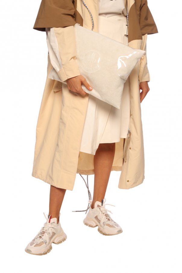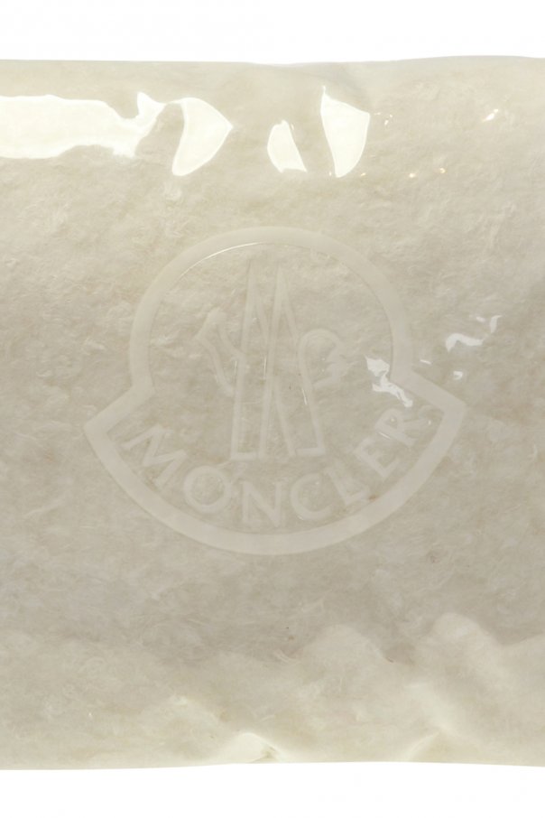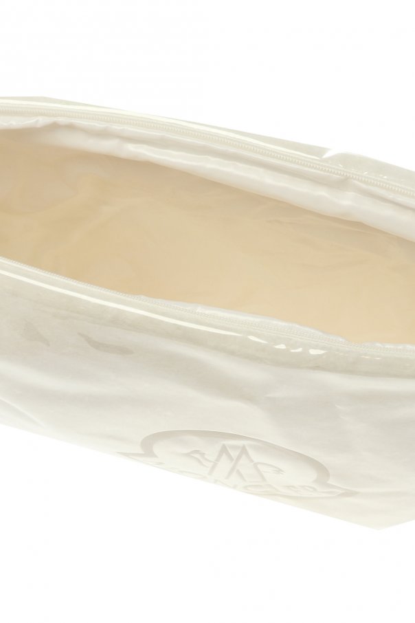 Cream 'Sioule' clutch from Moncler featuring zip fastening, embossed logo on the front and white, lined interior with one compartment inside.