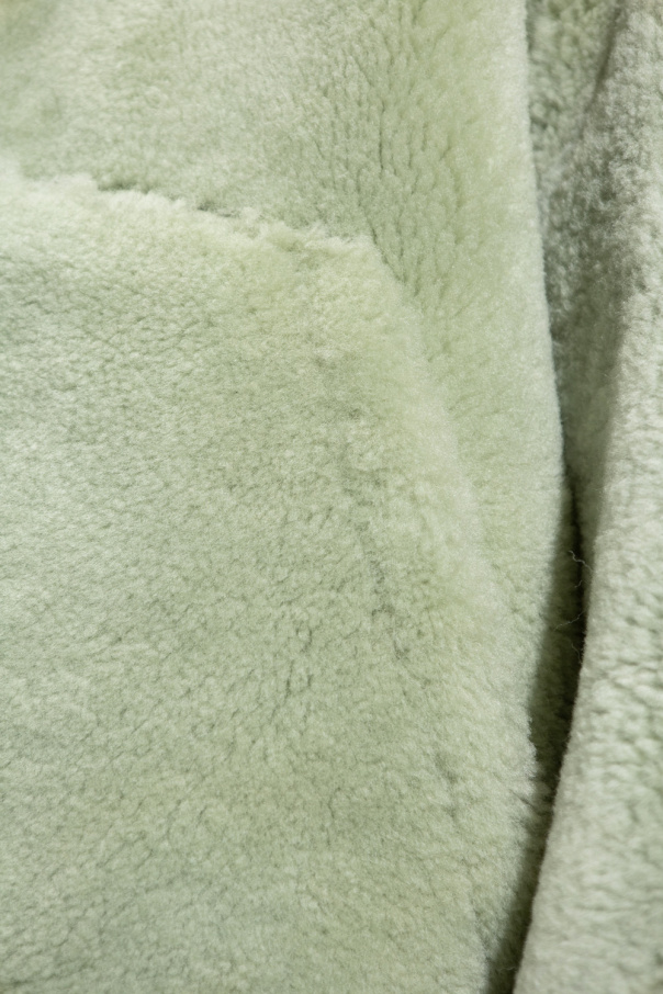 Light green ‘Pastre’ shearling jacket from Jacquemus. Crafted from lamb leather and lamb fur, this style fastens with a zipper and snaps and features two frontal slip pockets and long sleeves with zip cuffs.