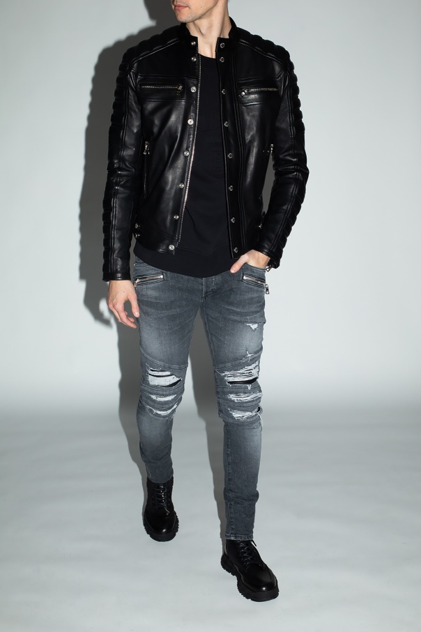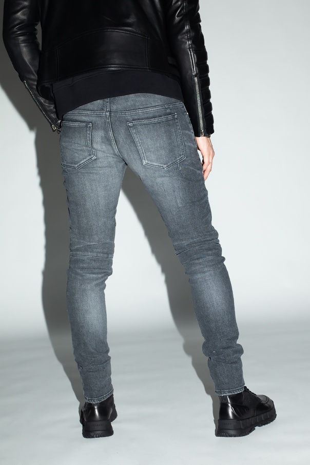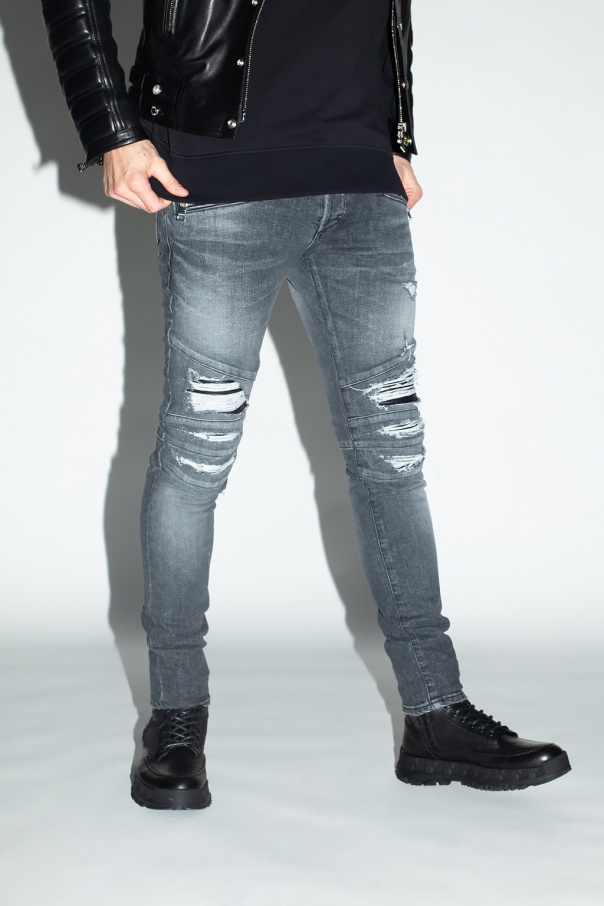 Grey distressed jeans from Balmain. Fastened with buttons, this design features button fastenings, a logo embroidery, four slip pockets and two zip pockets on the front as well as two slip pockets at the back.