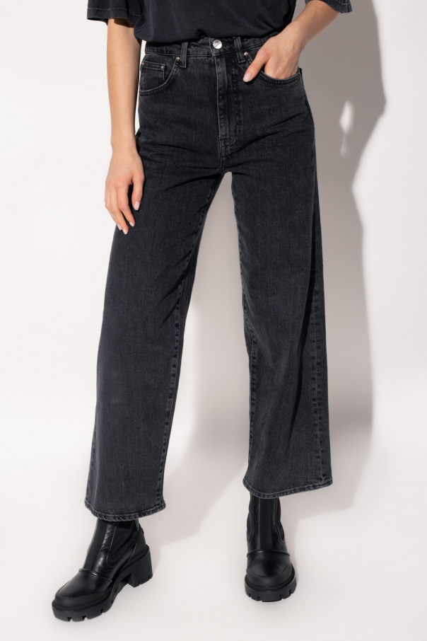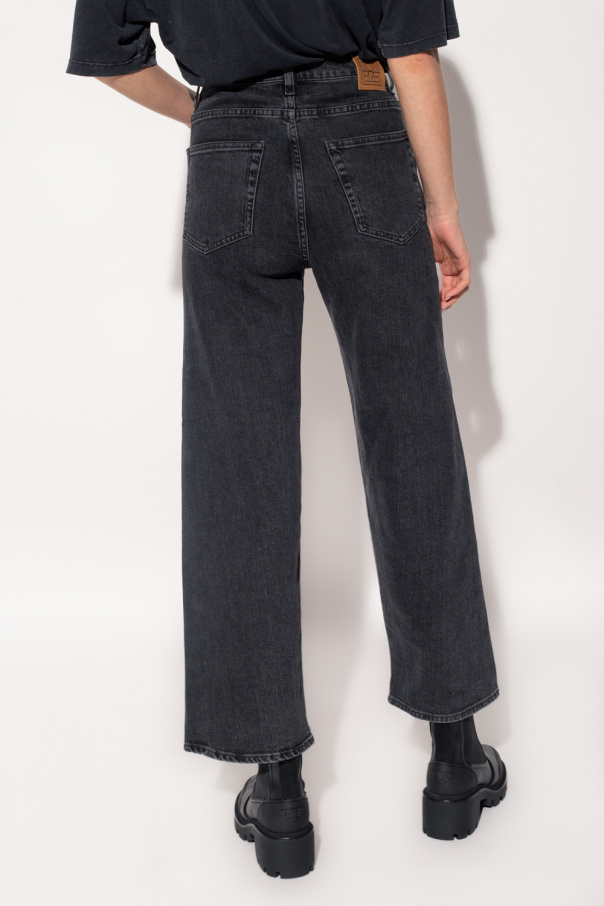 Dark grey jeans from Toteme. Crafted from cotton, this pair falls with straight legs and features a zip fly with a button, classic five pockets and a beige patch with a brown logo on the back.