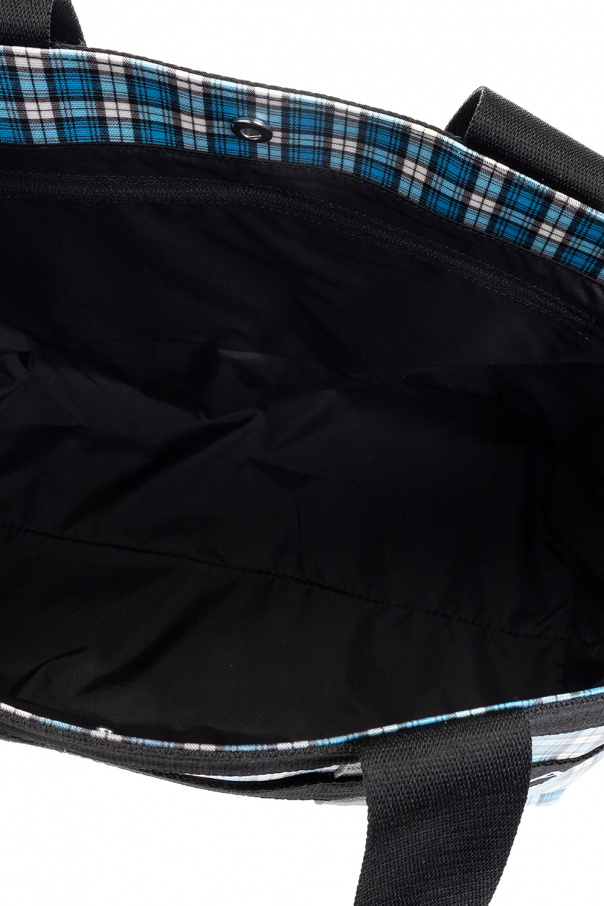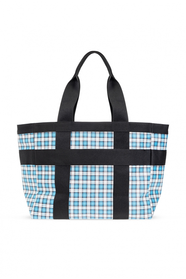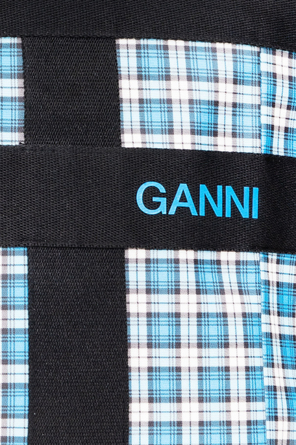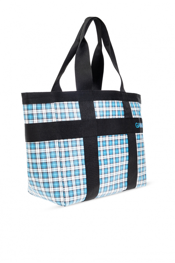 Blue, cream and black shopper bag from Ganni. Made of organic cotton, this model features a snap closure, check pattern, logo print, two half-round handles and one internal compartment with two slip pockets.