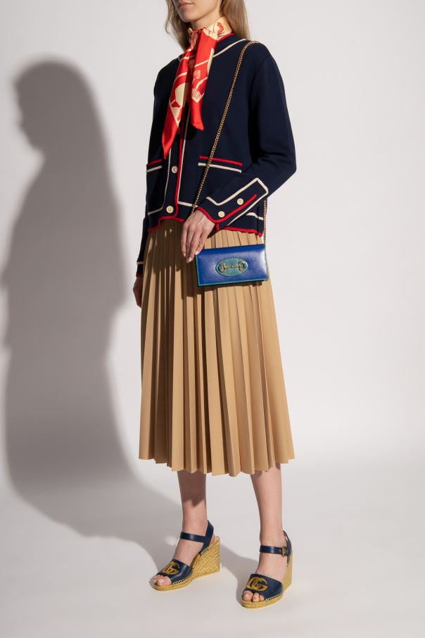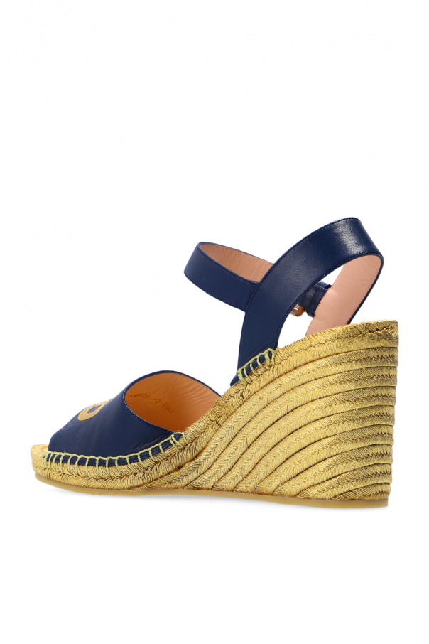 Navy blue and gold-tone wedge sandals from Gucci. Made of leather, this pair sits on a beige rubber sole and features a strap with an antiqued gold-tone buckle and a logo patch.