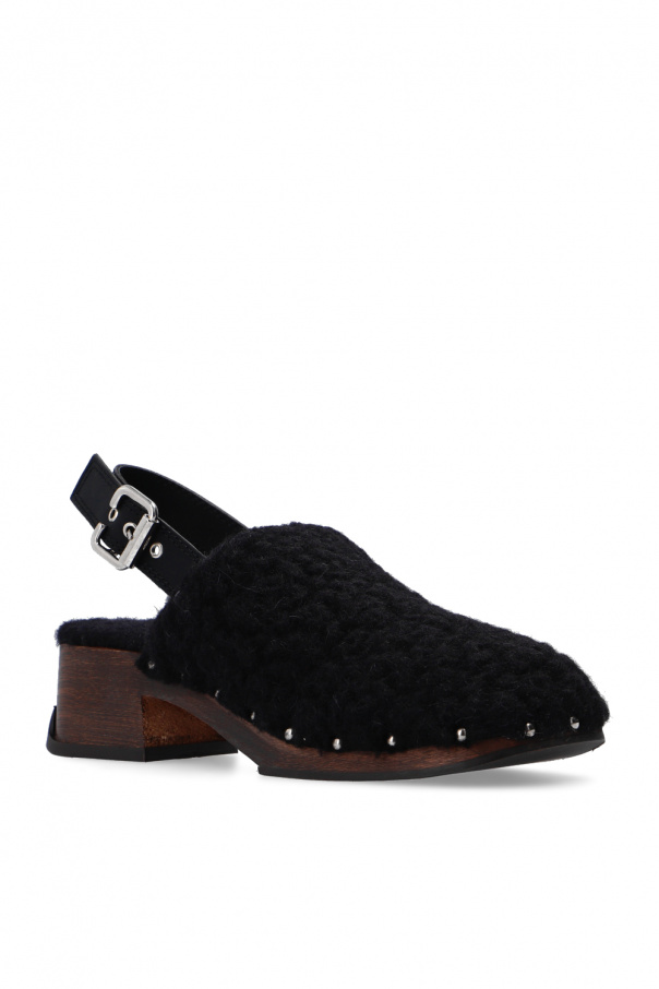 Black ‘Lana’ pumps from Miista. Set on a brown rubber sole, this pair features faux fur trims and buckled ankle straps.