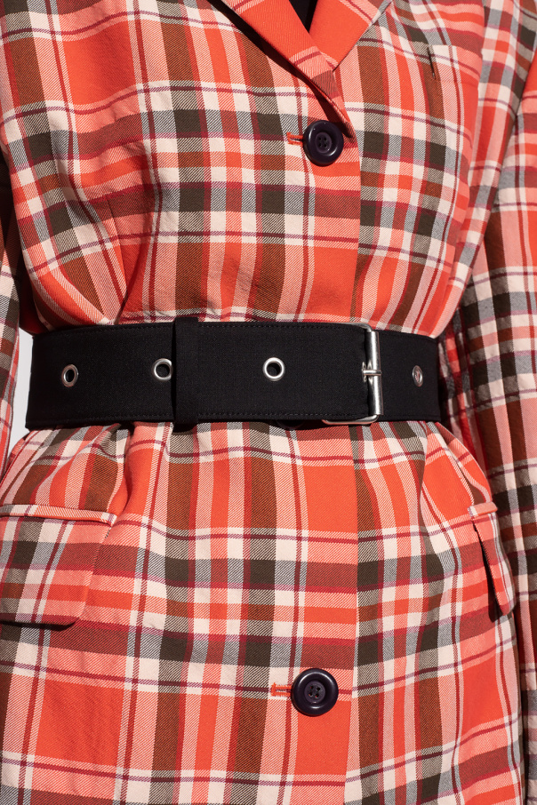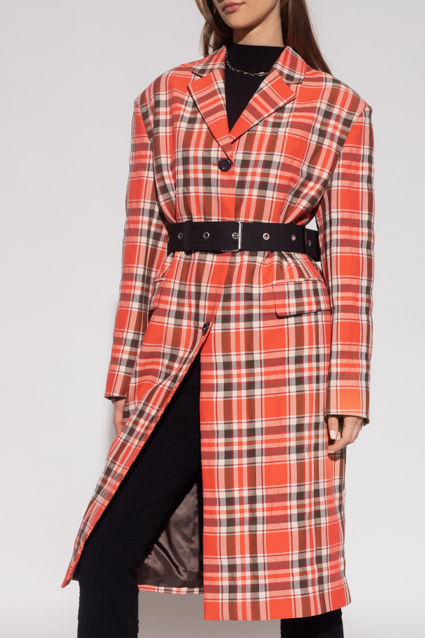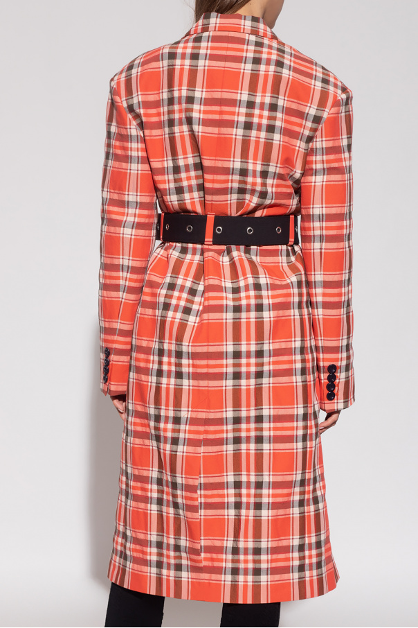 Red, cream and brown coat from Acne Studios. Crafted from cotton with an all-over check pattern, this style features button fastenings, a waist-cinching belt, two flapped pockets, a single back vent and long sleeves with button cuffs.
