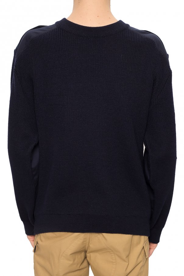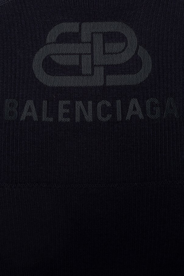 Navy blue rib-knit crewneck sweater from Balenciaga. Made of wool and cotton blend. Embellished with knitted brand's logo. Finished with ribbed trims.