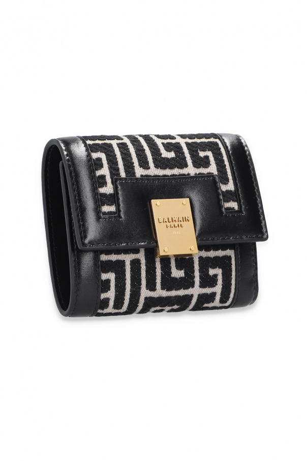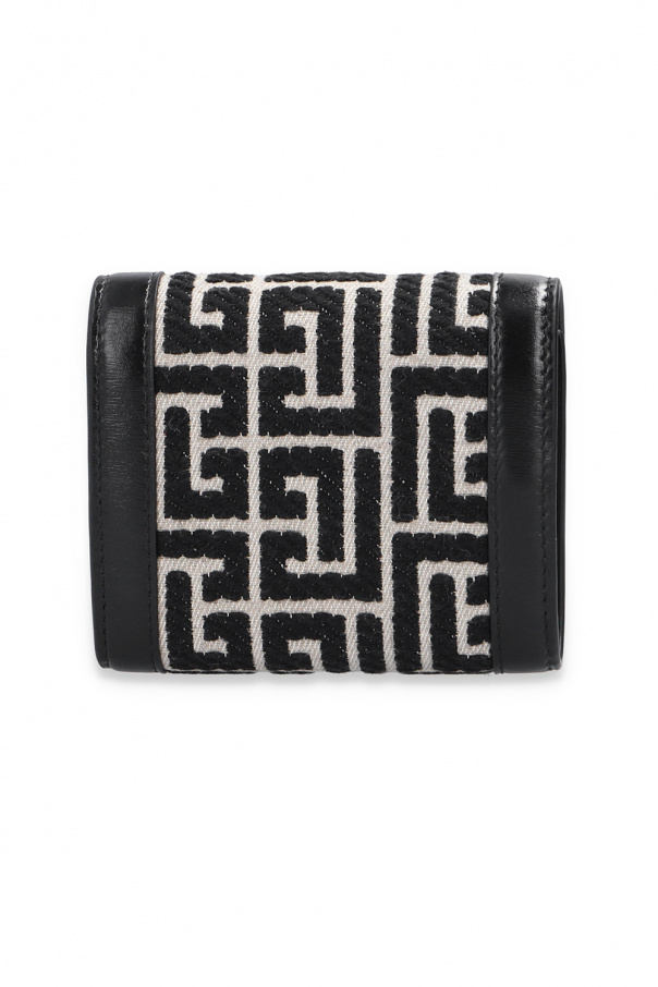 Black and cream wallet from Balmain. Embellished with a ‘B’ monogram pattern, this item features a snap fastening, gold-tone metal hardware and five card slots and one zipped coin pocket inside.