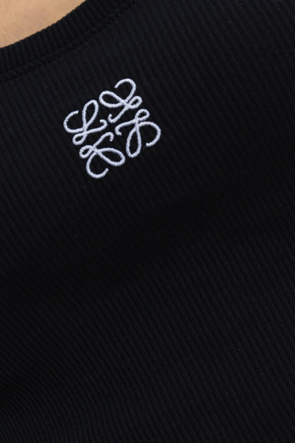 Black top from Loewe. Made of cotton with a ribbed texture, this style showcases an embroidered white logo pattern and an elasticated round neck.