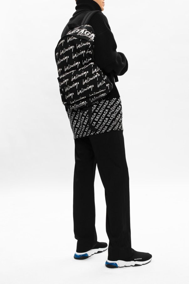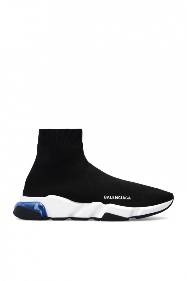 Black ‘Speed’ sock sneakers from Balenciaga. Decorated with a white logo print, this high-top model rests on a black and white rubber sole with a blue translucent insert.