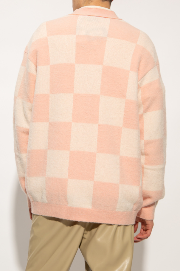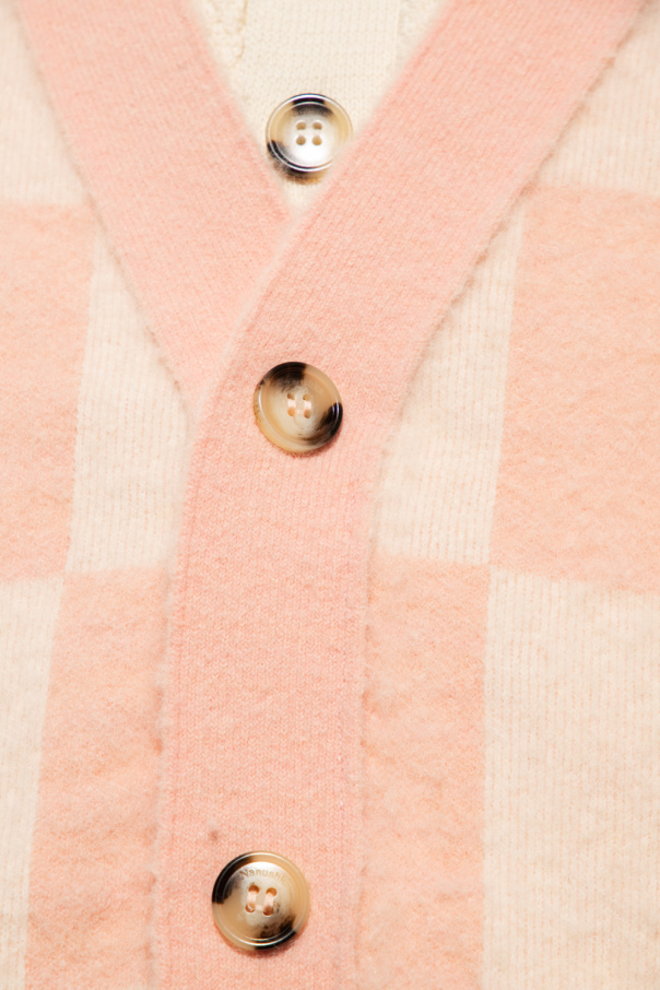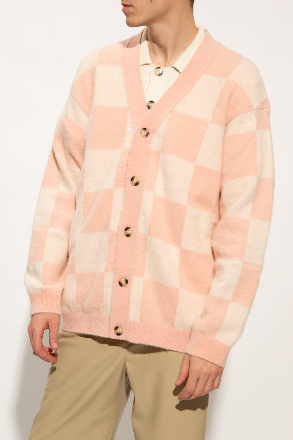 Pink and cream ‘Lait’ cardigan from Nanushka. Fastened with buttons, this garment is enriched by a check pattern and ribbed trims at the V-neck, hem and cuffs.