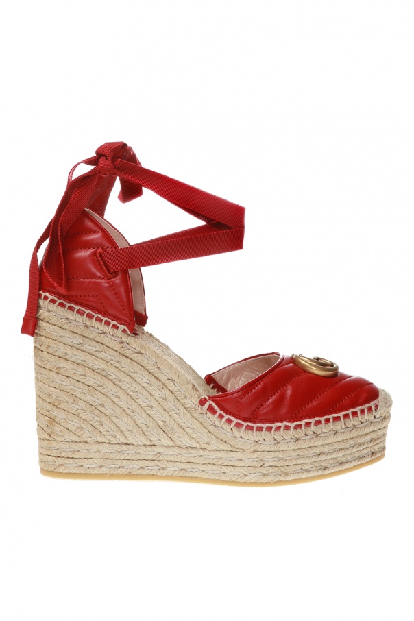 Red quilted wedge shoes from Gucci. Made of leather. Grosgrain strap around the ankle. Antiqued gold-tone metal logo on the front. Beige rubber sole.