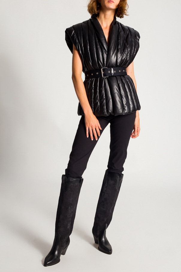 Black quilted vest from Isabel Marant. Crafted from lamb leather, this garment fastens with a buckle belt at the waist.