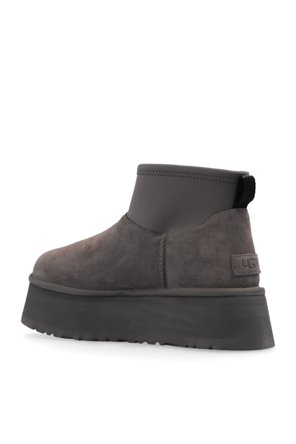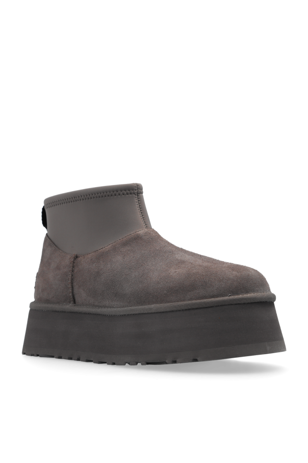 Introducing the Classic Mini Dipper, an exquisite piece from the renowned UGG collection. These ankle boots, crafted with the utmost precision, are a perfect blend of elegance and functionality. The Classic Mini Dipper showcases a sleek, minimalist design in a sophisticated gray hue. The exterior is masterfully constructed from high-quality suede, while the interior is luxuriously lined with a soft blend of wool and lyocell, ensuring unparalleled comfort and warmth. The upper collar, crafted from recycled polyester, adds a touch of sustainable elegance, making these boots not only stylish but also eco-conscious. With a robust rubber sole featuring a pronounced tread pattern, these boots offer excellent traction and durability, making them ideal for everyday wear. The discreet designer logo on the back and the convenient pull tab enhance the overall aesthetic and practicality of these boots. Why Choose This Product? Expertly crafted from premium materials for superior comfort and durability. Minimalist design in a versatile gray shade, perfect for any outfit. Warm lining made from a soft wool and lyocell blend. Recycled polyester upper collar for an eco-friendly touch. Durable rubber sole with excellent traction. Discreet designer logo for a touch of elegance.