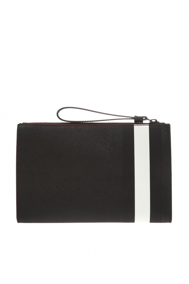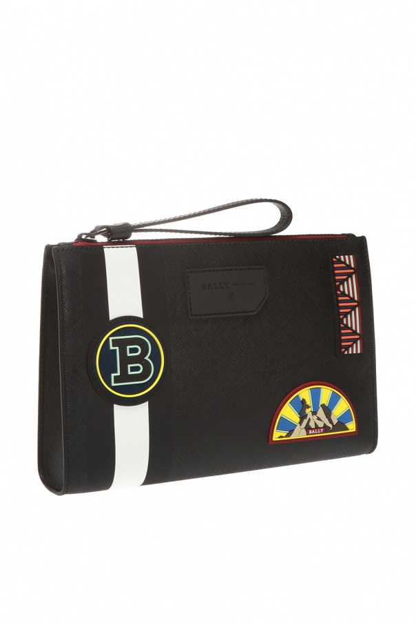 Black ‘Skid’ clutch from Bally. Fastened via zip including wrist strap. Embellished with black and white graphic print and colourful rubberised logo patches. Interior has 1 compartment and 3 slip pockets inside.