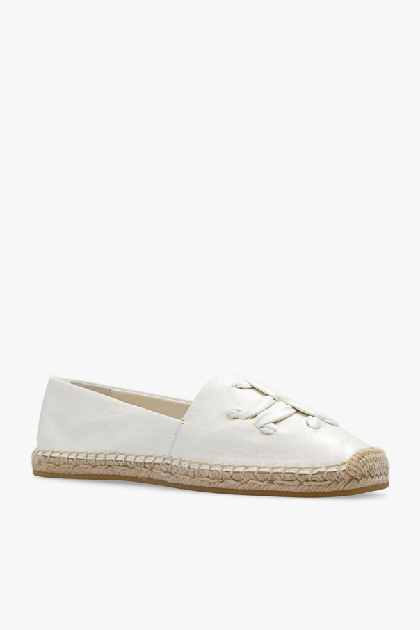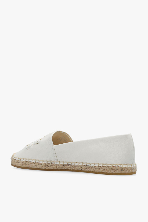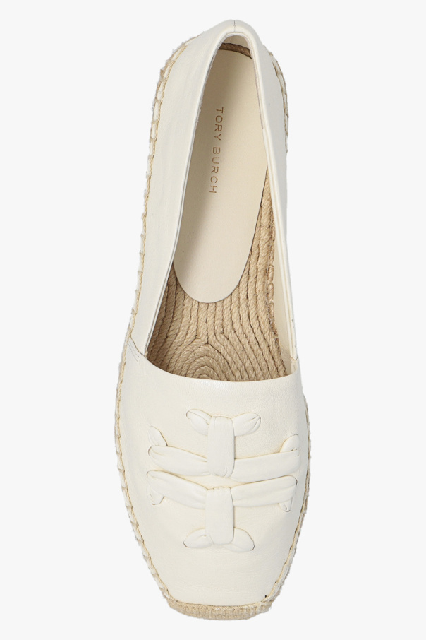 Cream espadrilles from Tory Burch. Made of leather, this model sits on a beige woven jute sole with a rubber trim and showcases the brand's logo on the front.