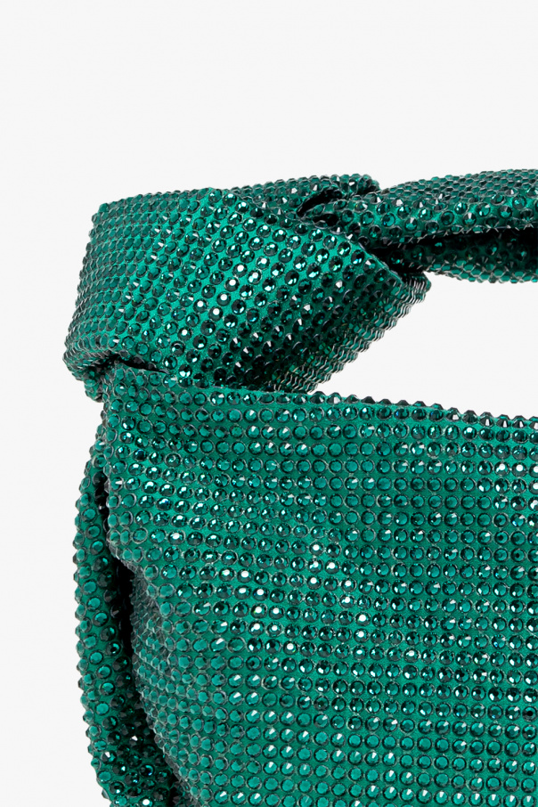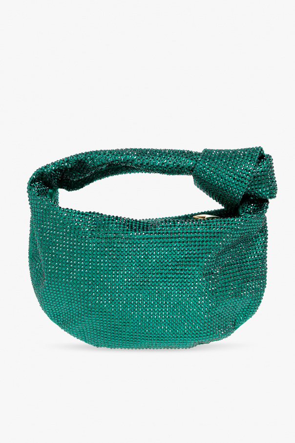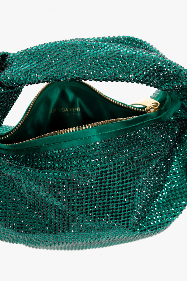 Green ‘Jodie Mini’ handbag from Bottega Veneta. Crafted from satin embroidered with glossy rhinestones all over, this design features a zip fastening, a short handle with a distinctive knot, gold-tone metal hardware and one internal compartment.