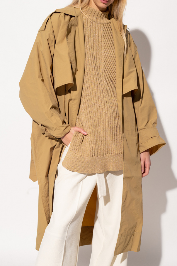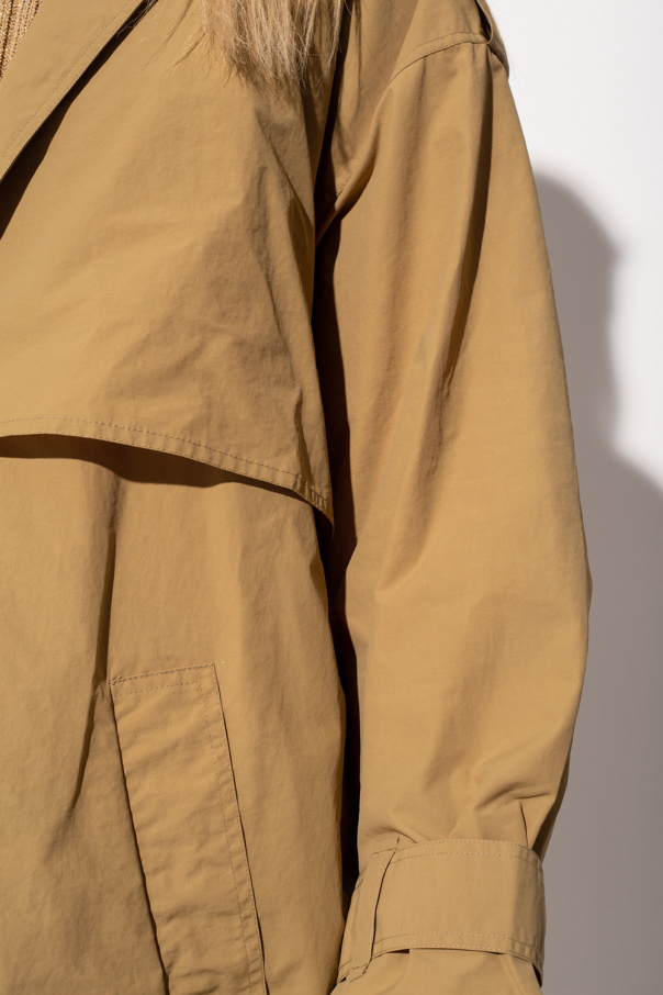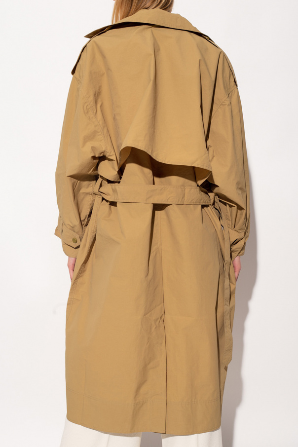 Beige trench coat from Aeron. Crafted in water-repellent material, this style features two slip pockets and a waist-cinching belt.