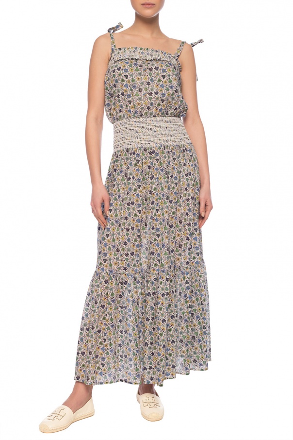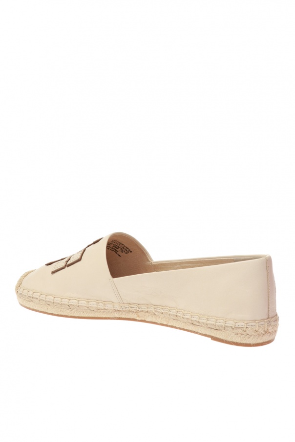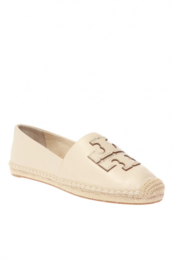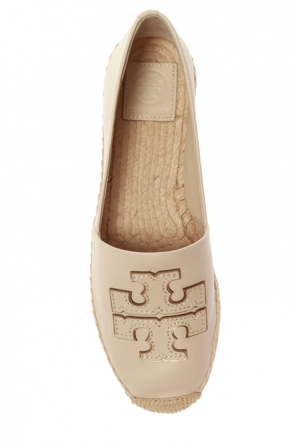 Cream espadrilles from Tory Burch. Made of leather. Finished with textile inserts. Embellished with embroidered beige and gold-tone logo on the front. Seated on a brown rubber sole.