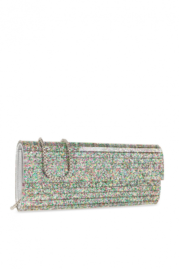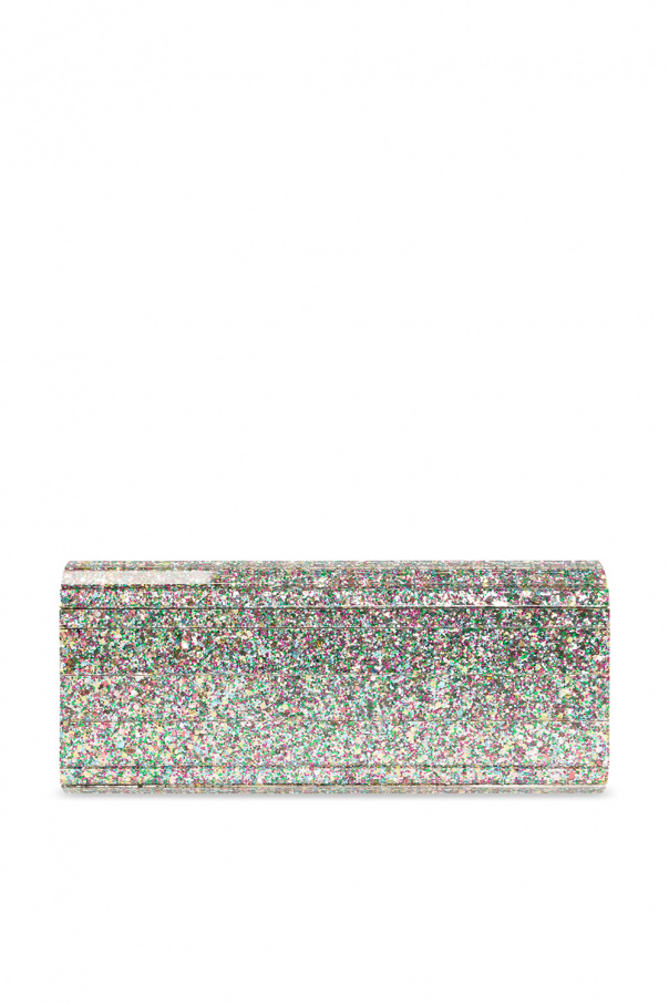 Mutlicolored ‘Sweetie’ glittered clutch from Jimmy Choo. Crafted from transparent plexiglass, this model is complete with a magnetic closure, engraved logo, detachable chain, silver-tone metal hardware and one internal compartment with lamb leather and silver-tone satin lining as well as one slip pocket.