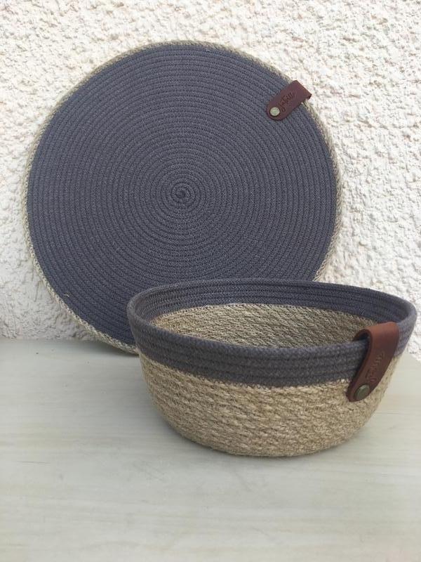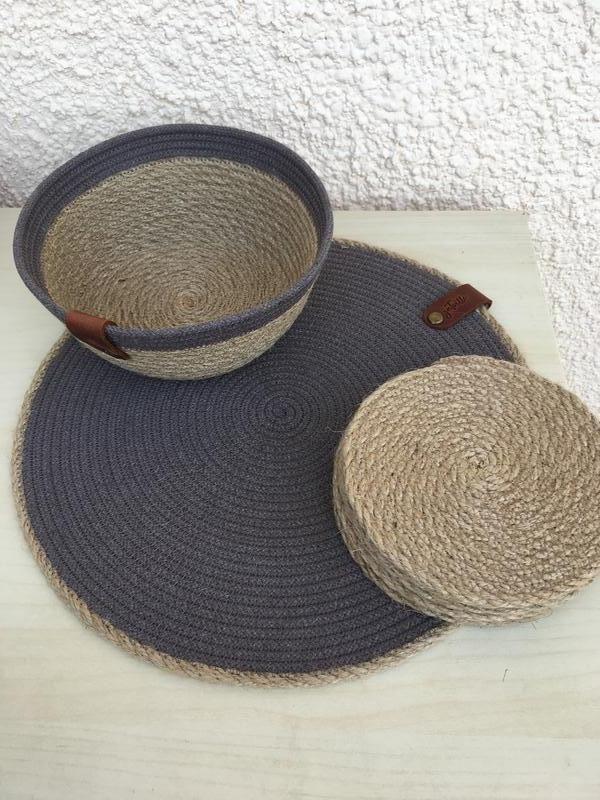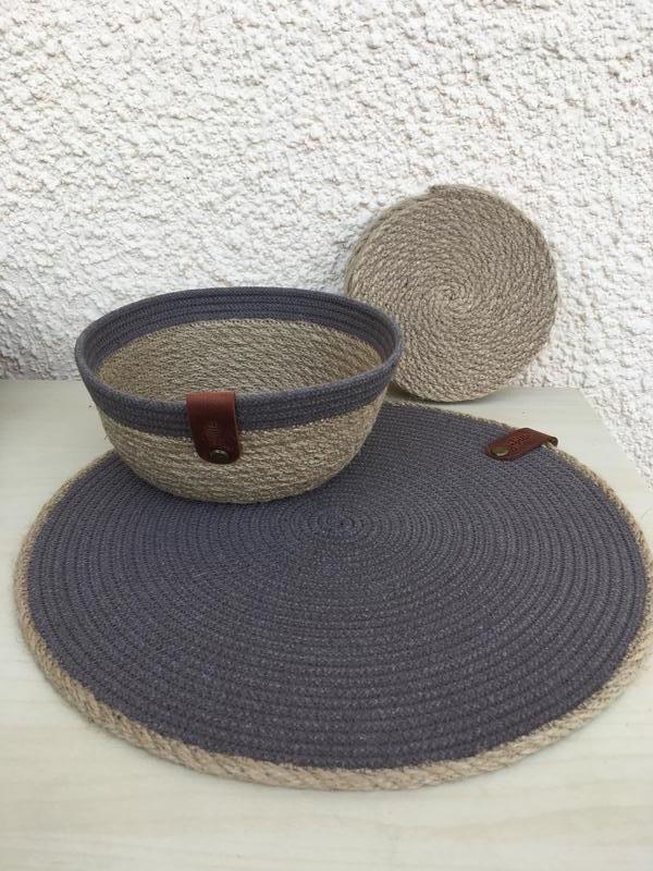 Красивые стильные салфетки под тарелки из хлопкового шнура с джутовой окантовкой, костеры - поставки под чашки, корзинка для печенья, конфет, хлеба, орехов и т.д