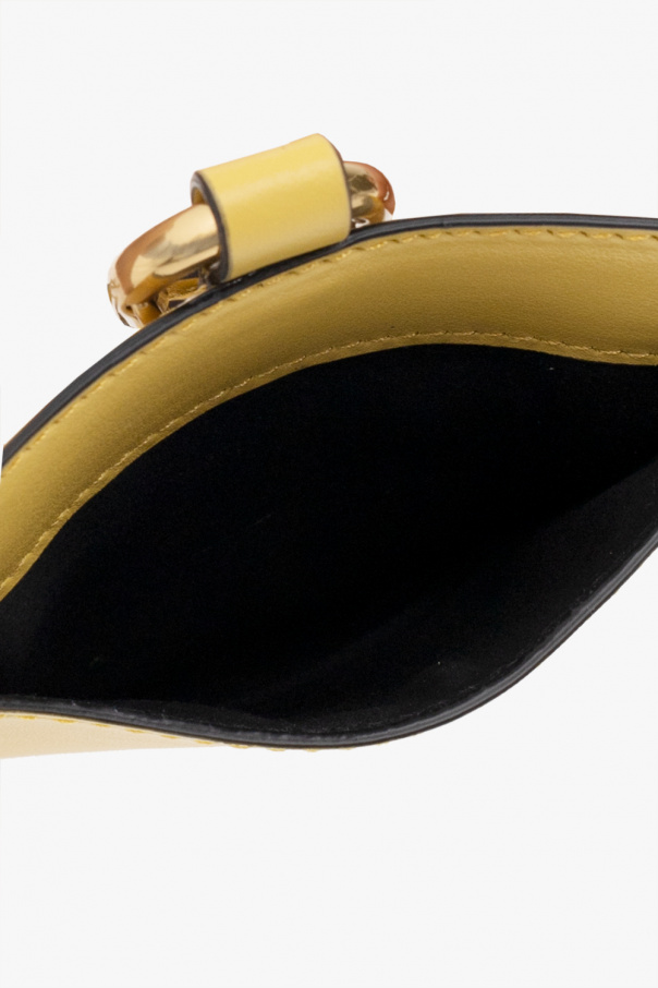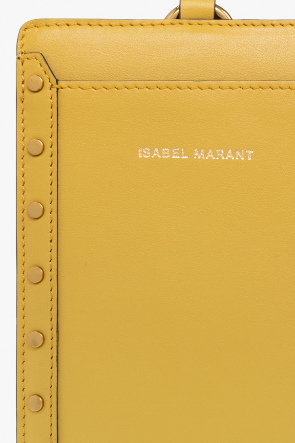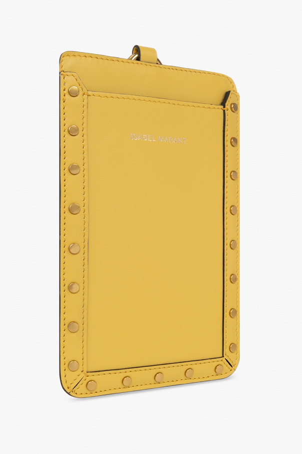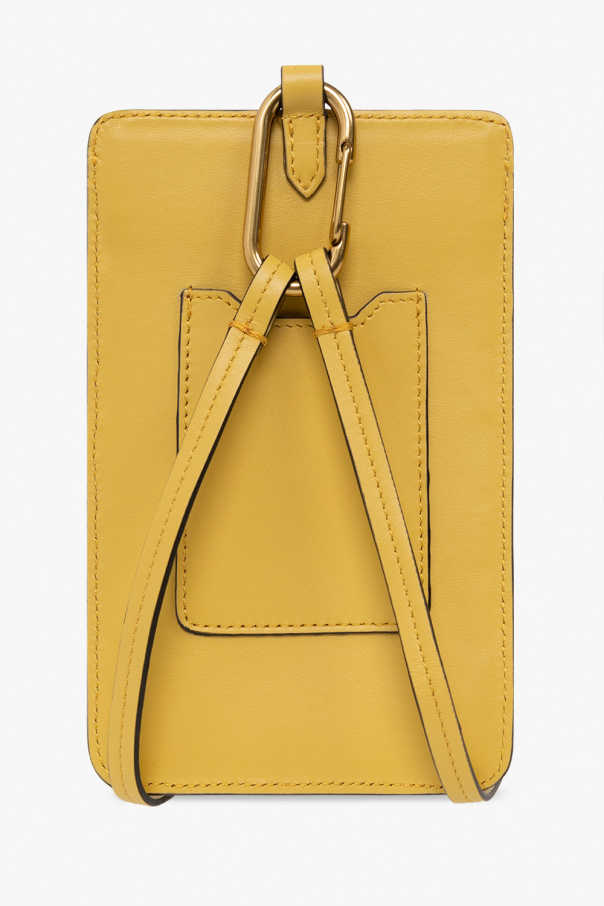Yellow ‘Tieli’ phone holder from Isabel Marant. Crafted from calf leather, this design is printed with a gold-tone logo and punctuated with studs. It features a back card slot, a detachable and adjustable strap, antiqued gold-tone metal hardware and one internal compartment.