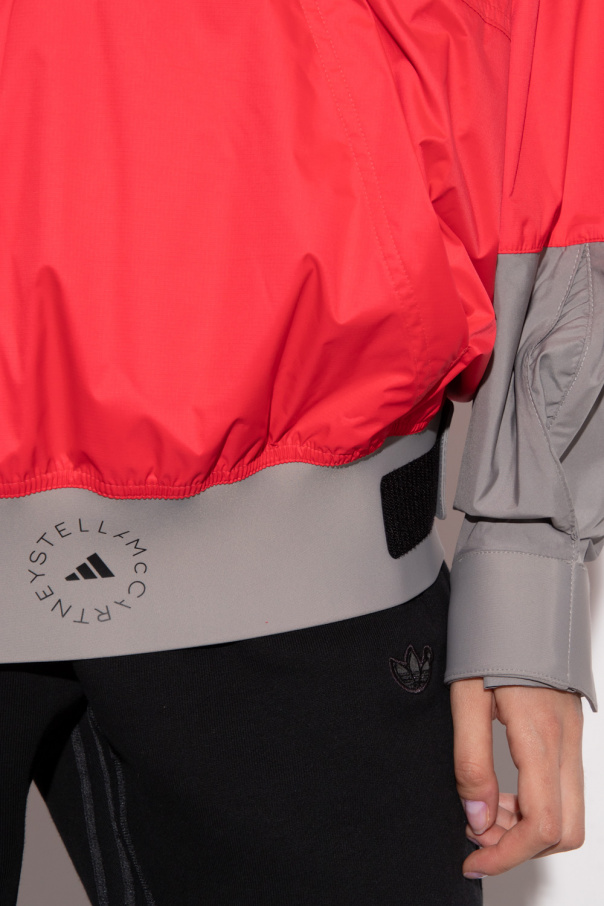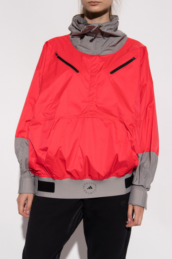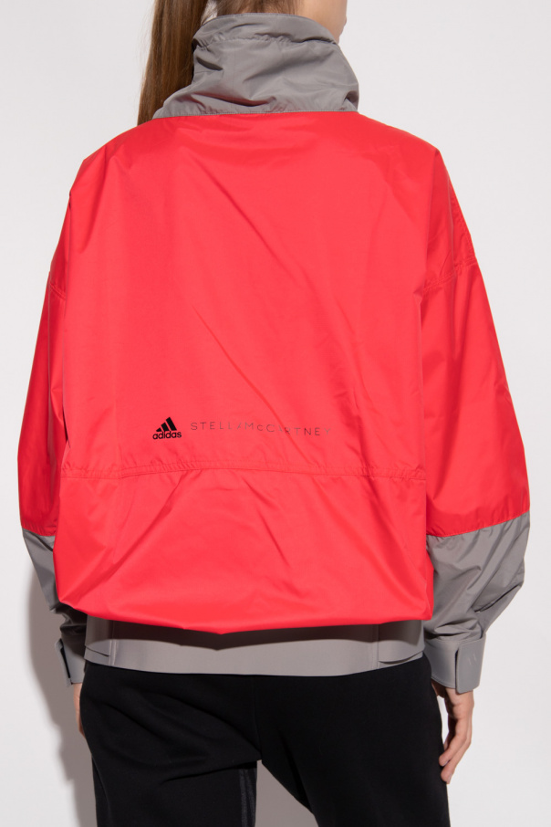 Red, pink and grey jacket from ADIDAS by Stella McCartney. Fastened with a hook-and-loop closure, this garment features a high collar with drawstrings, two zip pockets, two slip pockets and ribbed trims at the hem and cuffs with a hook-and-loop closure.