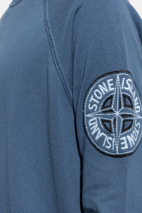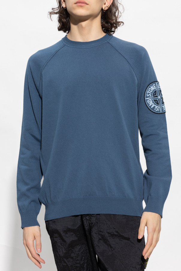 Blue sweater from Stone Island. Made of a cotton blend, this long sleeve design features a detachable sleeve patch with a logo and ribbed V-neck.