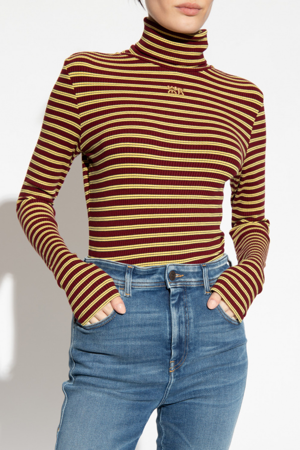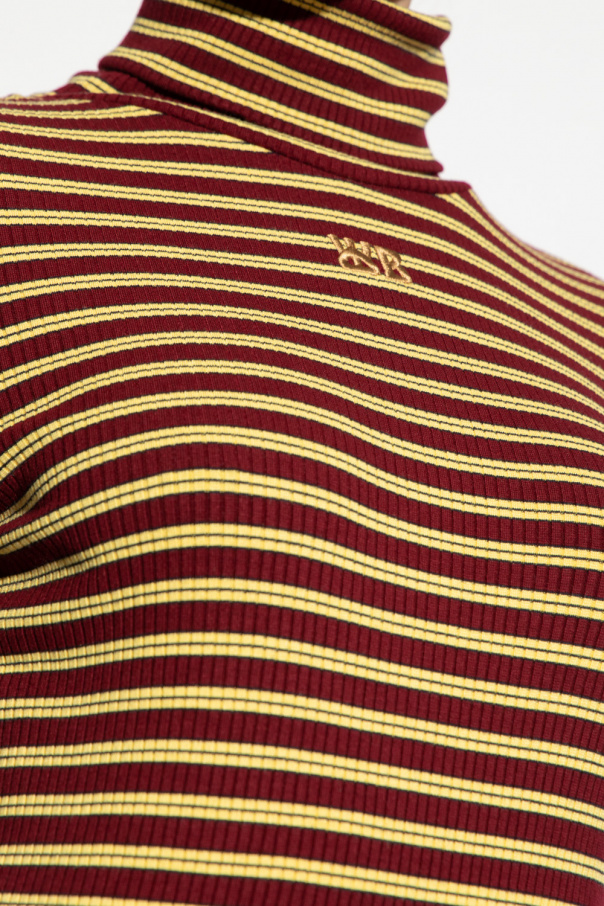 Maroon and yellow ‘Sonic’ turtleneck sweater from Wales Bonner. Made of ribbed fabric, this long sleeve design features a light brown logo embroidery and stripe pattern.