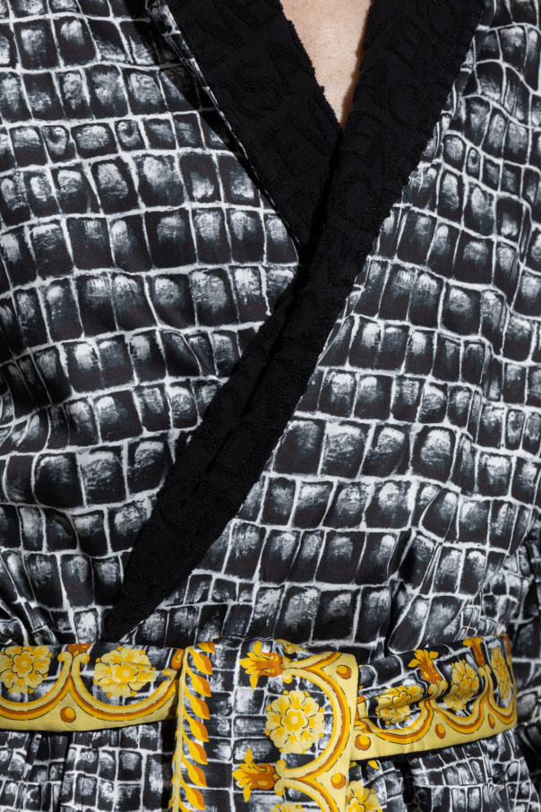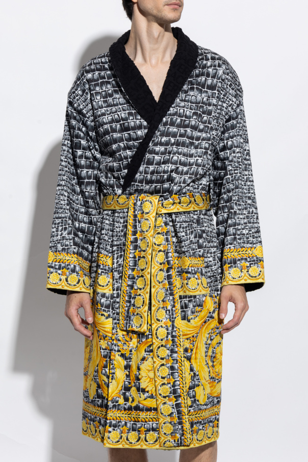 Black and white bathrobe from Versace Home. Made of cotton, this style is cinched with a tie belt and showcases a decorative graphic print in yellow and orange, two frontal pockets and long sleeves.