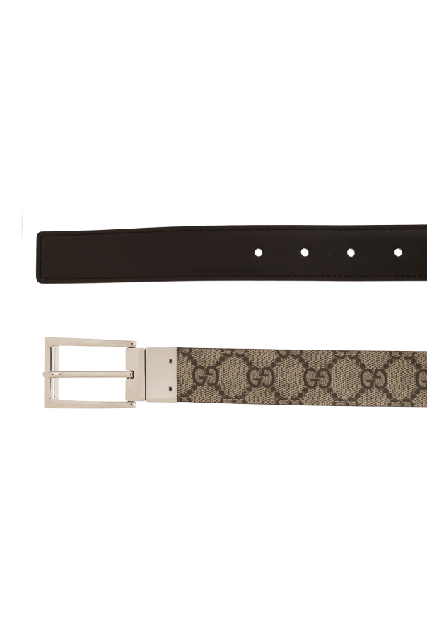 Reversible belt from Gucci. One side is made of the brand's signature ‘GG Supreme’ canvas in beige and brown. The other side is made of dark brown calf leather. The design is complete with a silver-tone buckle with an engraved logo.