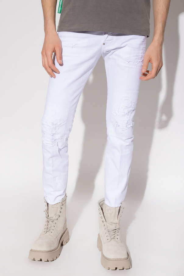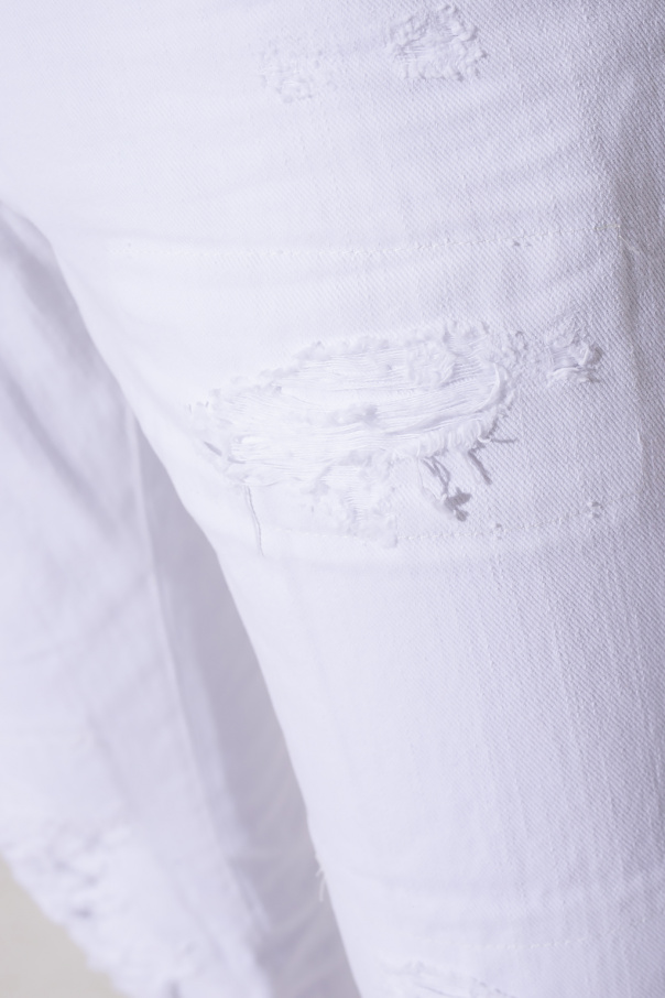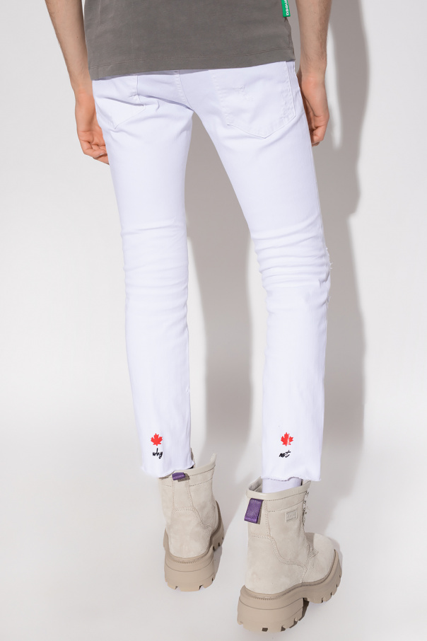 White ‘Skater’ distressed jeans from Dsquared2. Fastened with buttons, this pair features button fastenings, red and white logo patch, stitching details, logo patch at the back, five slip pockets and tapered legs with raw cut edges as well as a black and red appliqué with the label’s signature maple leaf patch.