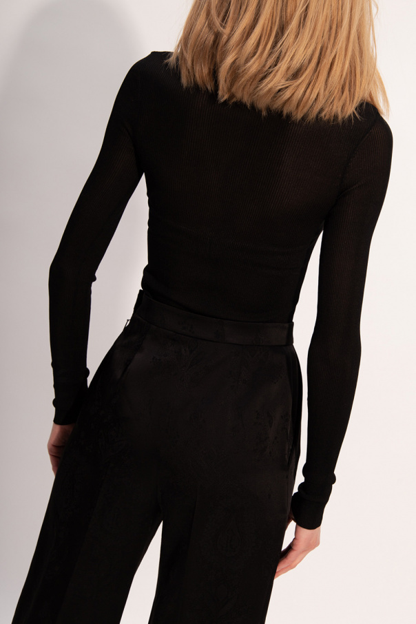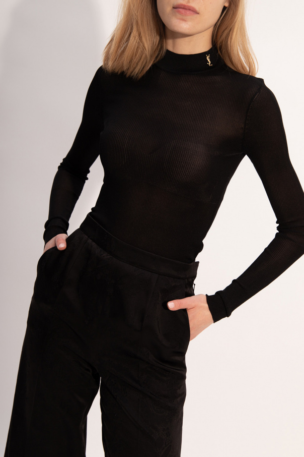Black see-through top from Saint Laurent. Crafted from silk, this style features a mock neck, long sleeves and a gold-tone YSL plaque.