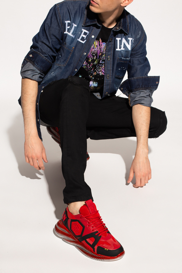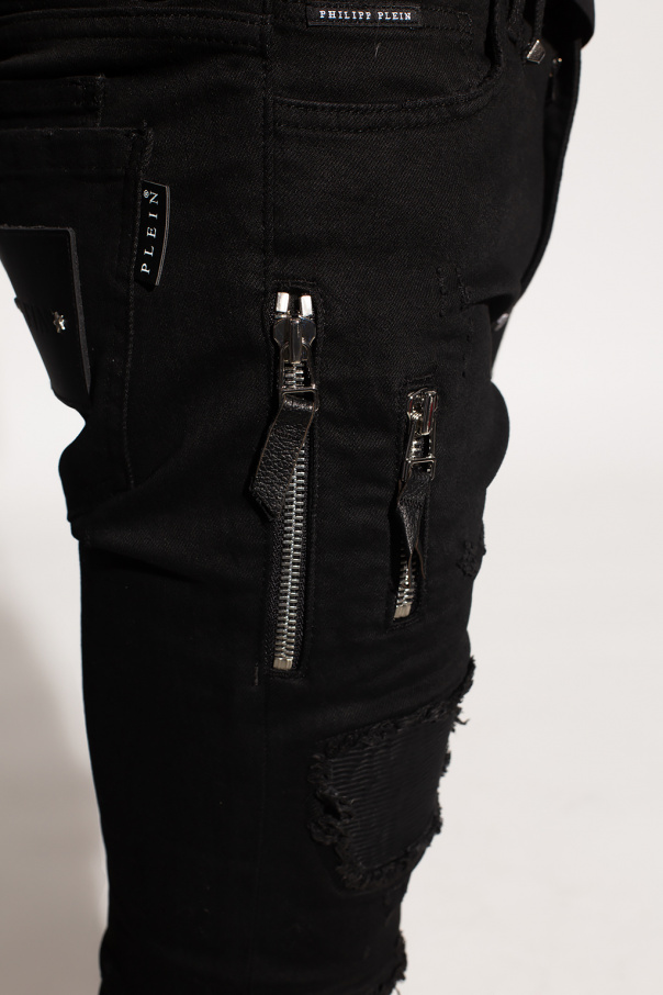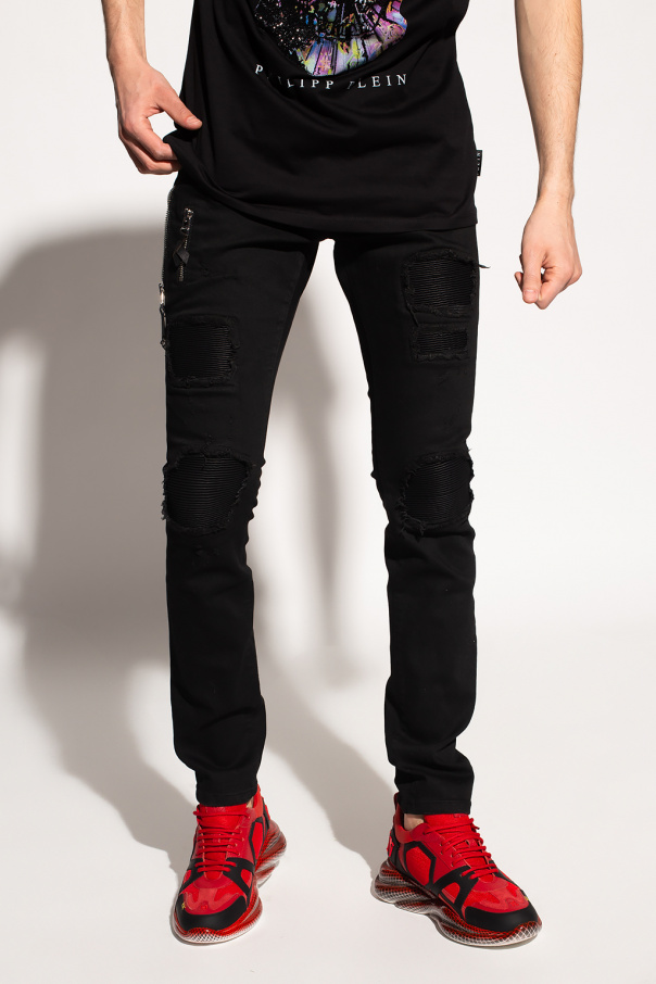 Black jeans from Philipp Plein. Fastened with a zip and buttons, this pair falls down with straight legs and features a logo patch, multicolored appliqué, zip details, three front pockets and three back pockets.
