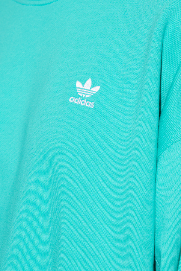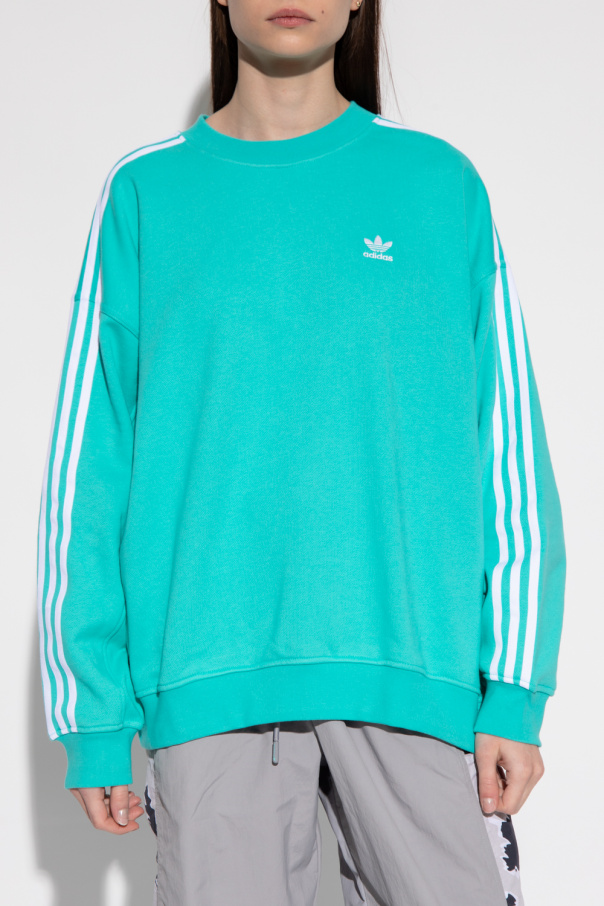 Blueish green crewneck sweatshirt from ADIDAS Originals. Crafted from cotton jersey with an oversize silhouette, this style showcases white logo embroidery on the front, the brand's signature three stripes on the shoulders and ribbed trims on the collar, bottom hem and cuffs.