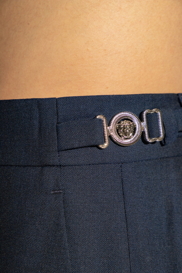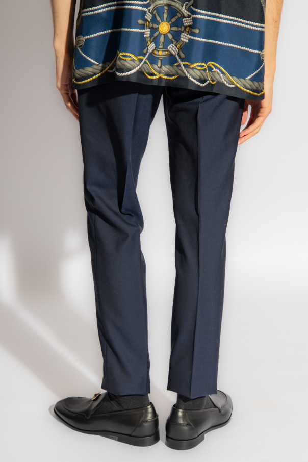 Navy blue pleat-front trousers from Versace. Falling with slightly tapered legs, this pair features a zip fly with a button and hook, four slip pockets as well as silver-tone hardware with the brand's signature Greca and Medusa face motifs at the waist.