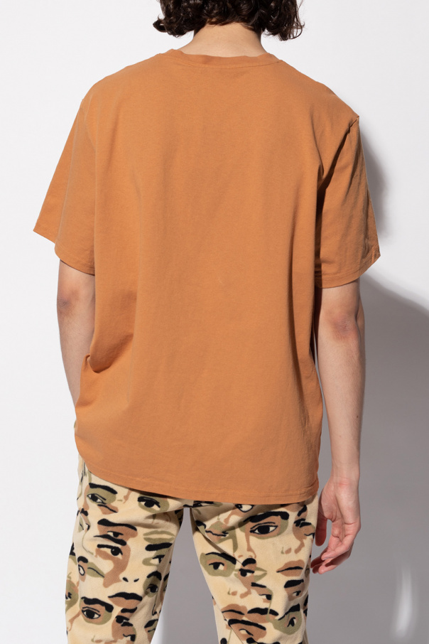 Light brown crewneck T-shirt from Puma x Kidsuper Studios. Made of cotton, this garment is decorated with a purple logo print and yellow logo embroidery.