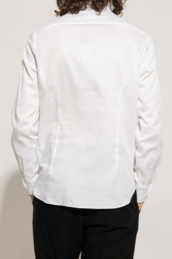 White shirt from Emporio Armani. Made from cotton with a fitted silhouette, this style features an embroidered monogram, front button fastenings and long sleeves with button cuffs.