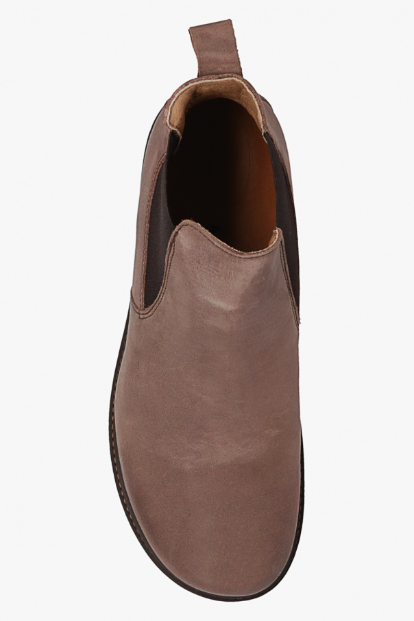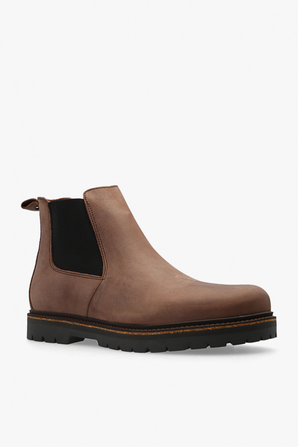 Brown ‘Stalon II’ Chelsea boots from Birkenstock. Crafted from oiled nubuck leather, this model sits on a dark brown rubber sole and features elastic panels and an embossed logo on the side.