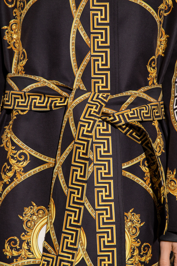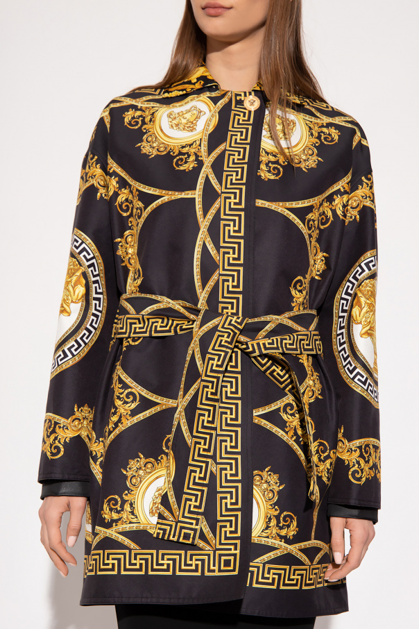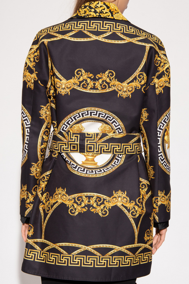 Black reversible coat from Versace. Crafted from a cotton and silk blend, this long sleeves design features a button with the iconic Medusa head in gold-tone, La Coupe des Dieux pattern in yellow, brown and white, tied waist belt and two slip pockets.