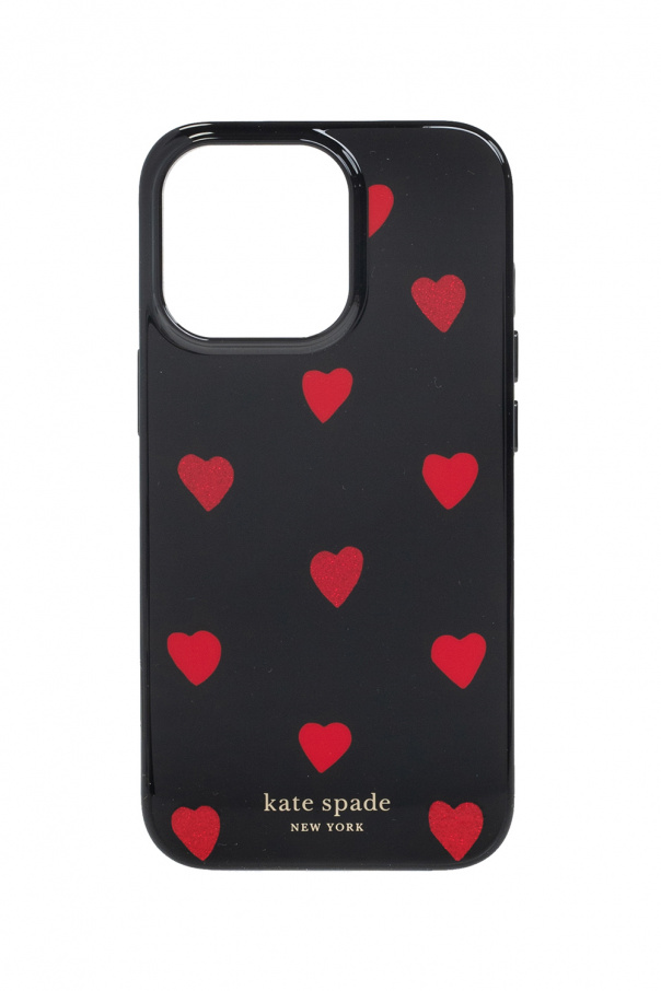 Black iPhone 13 Pro case from Kate Spade. Crafted from durable resin with a glittery red heart print, this item features a gold-tone logo stamp.